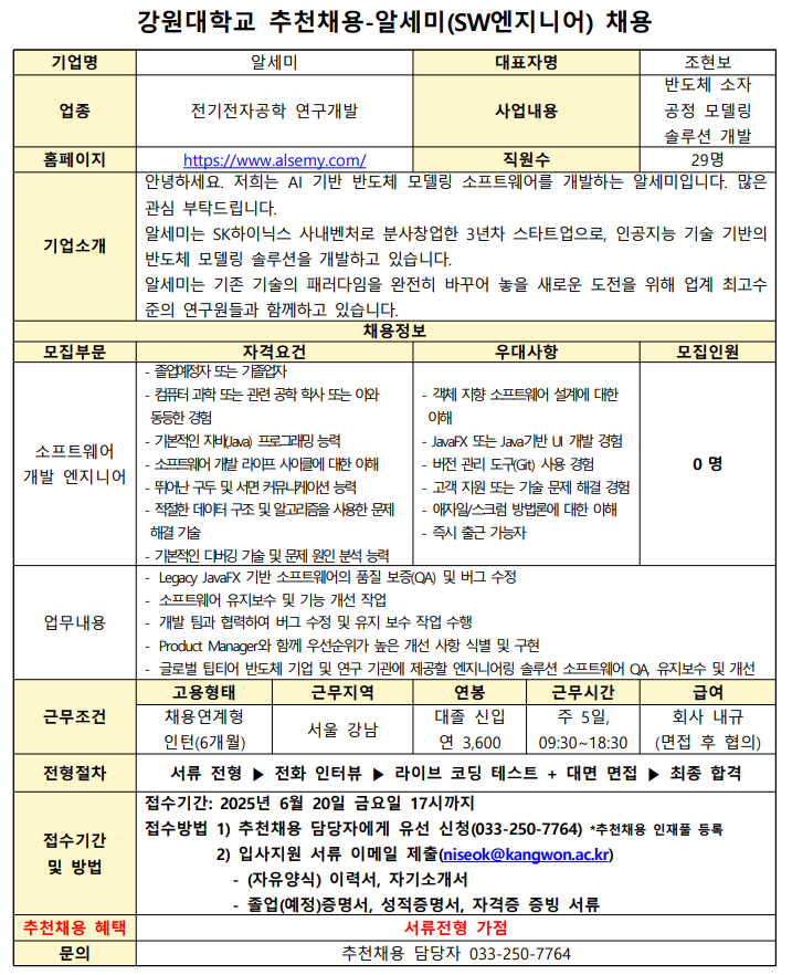AI기반 반도체 모델링 소프트웨어 개발 기업 <알세미>에서소프트웨어 개발 엔지니어 채용을 강원대학교 추천채용으로 진행합니다.추천채용 지원자에게는 서류전형 가점 혜택이 있습니다.관심있는 분은 문의주세요.^^