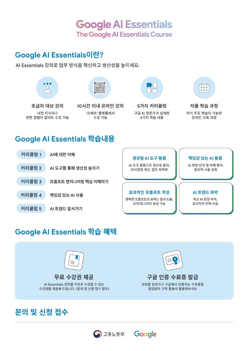 고용노동부와 구글코리아가 협력하여 운영하는 「Google AI Essentials」 교육 과정을 아래와 같이 안내하오니, 관심있는 학생들의 많은 참여바랍니다.